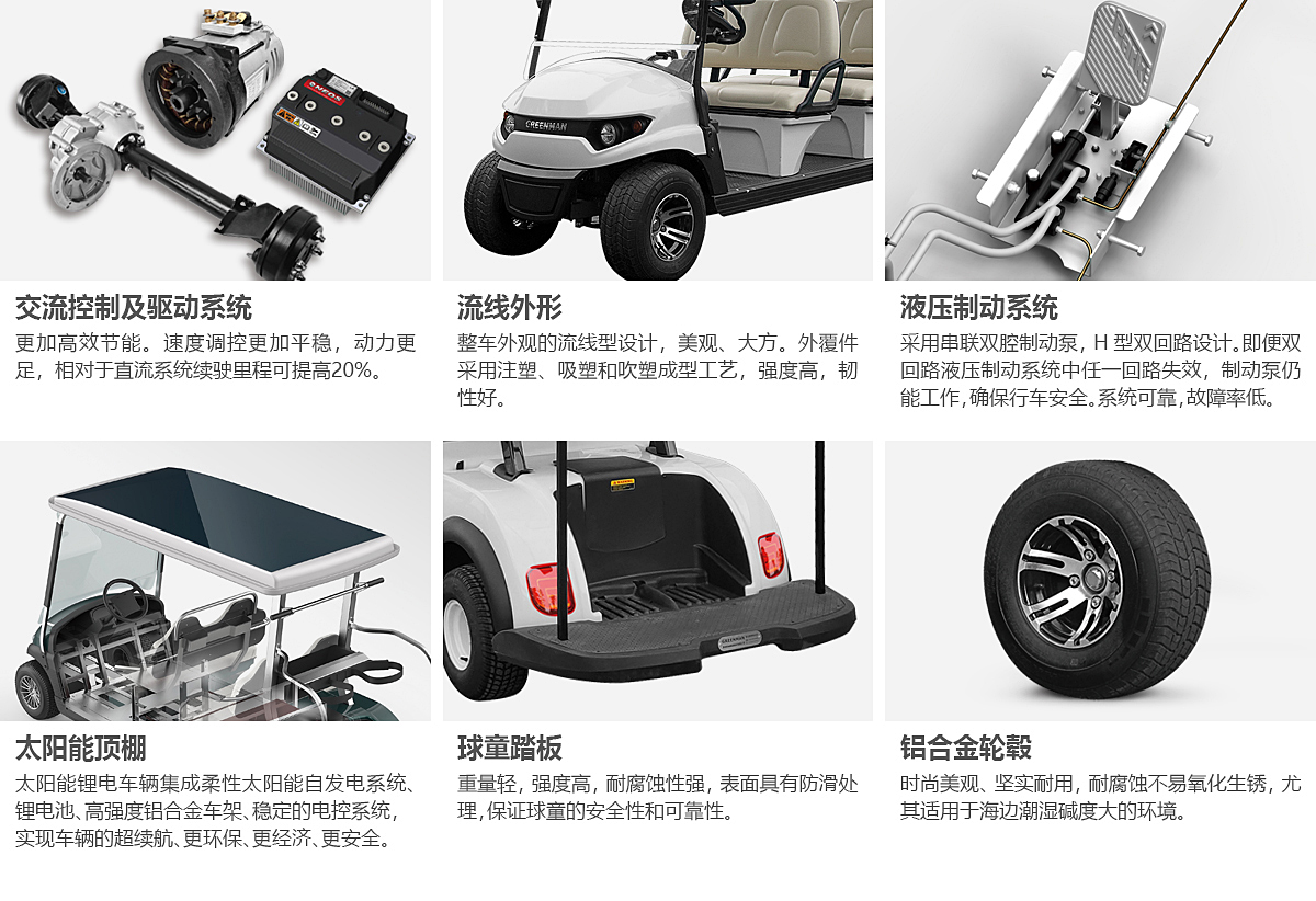 同向四座高爾夫球車,可以供4名球手和2名球童同時(shí)駕乘,也可以供3名球手和3名球童同時(shí)駕乘。